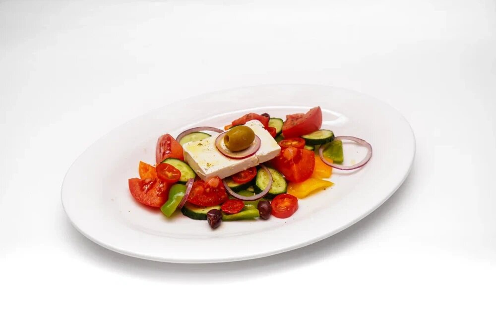 Фета ірімшігі , зәйтүн, болгар бұрышы ,қызғылт қызанақ, қияр, қызыл пияз, черри қызанақтары, зәйтүн майы, каламатто зәйтүні, грек гигант зәйтүні