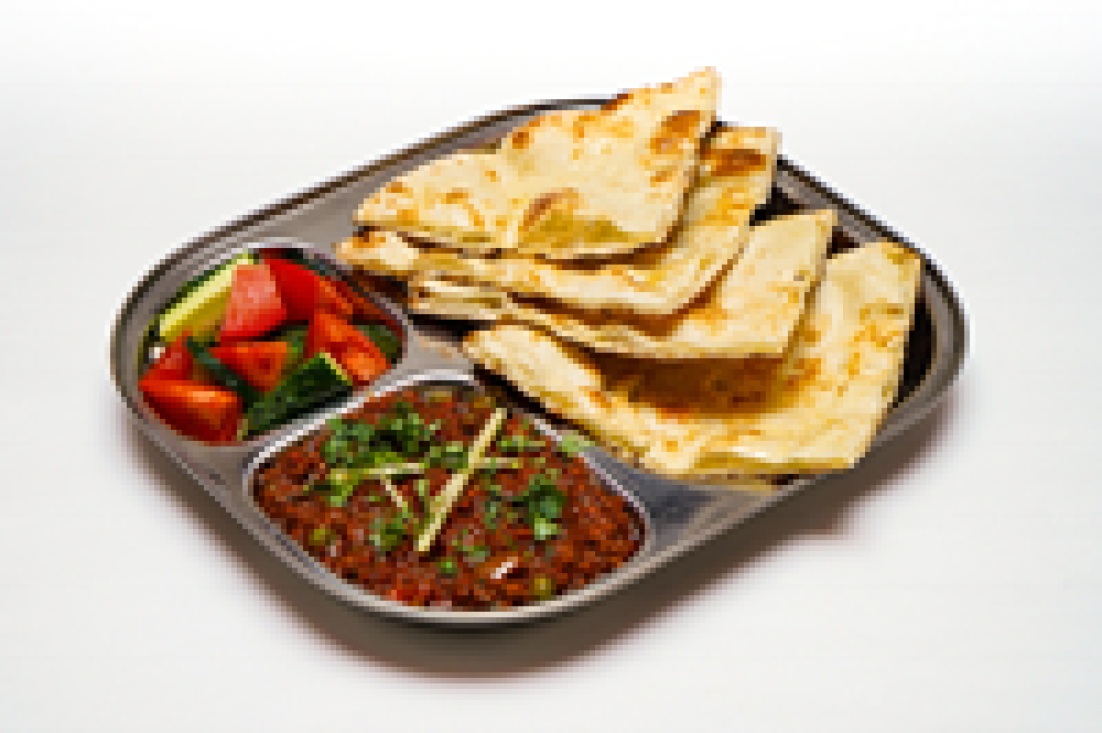 Тартылған жас қой еті, қияр, қызанақ, роти шелпек, үнді дәмдеуіштері.