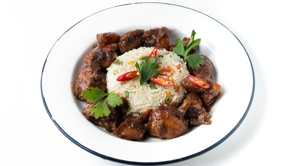 Зімбір мен сарымсақ қосылған соя тұздығында тауық еті мен картоп қосылған көкөніс күріштен жасалған филиппиндік ұлттық тағам. Ақжелкенмен безендіріледі