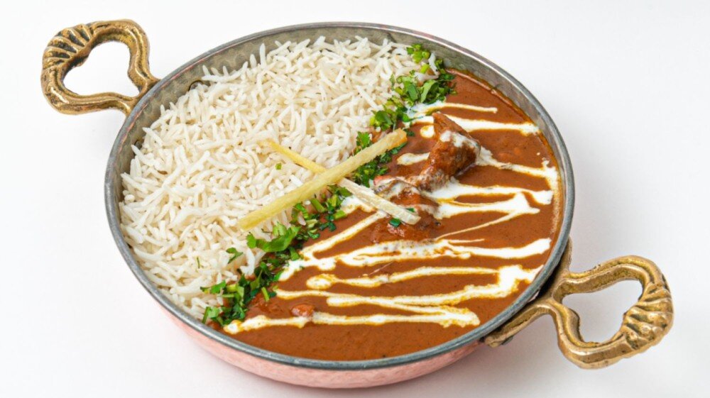 Шырынды пияз-қызанақ тұздығындағы үнді дәмдеуіштері бар нәзік тауық еті/панир ірімшігі. Басмати күрішімен бірге беріледі