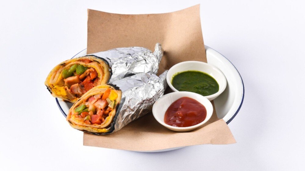 Чикен тика, көкөністер, Чили бұрышы, үнді дәмдеуіштері, роти жұқа наны, жұмыртқа, жасыл тұздық және кетчуп