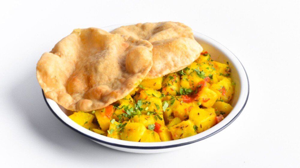 Пісірілген картоп, үнді дәмдеуіштері, чили, сарымсақ, зира, 2 сортты ұн, өсімдік майы, кинза.