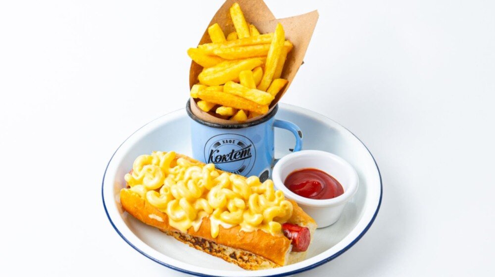 Ысталған сиыр еті шұжығы, песто тұздығы, қатты бидай макарондары, кілегей, чеддар ірімшігі, фри картоптары және кетчуп