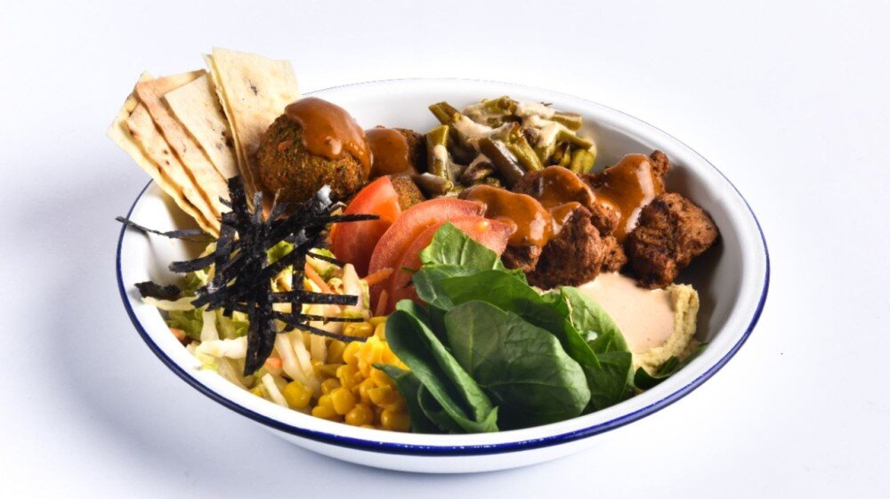 Саумалдық, қытай қырыққабаты, сәбіз, жасыл бұршақ, соя шницелі, жасыл бұршақ фалафелі, жүгері, тәтті және қышқыл тұздығы, тәтті және ащы тұздығы, қызанақ, жержаңғақ тұздығы, хумус, жүгері, нори