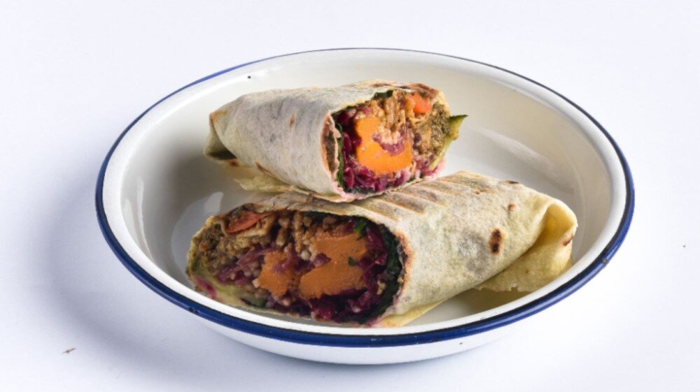 Лаваш, саумалдық, маринадталған қызыл қырыққабат, итальяндық шөптерде пісірілген асқабақ, пияз, болгар бұрышы, кускус, қияр, ламинария тұздығы, күнбағыс тұқымдары