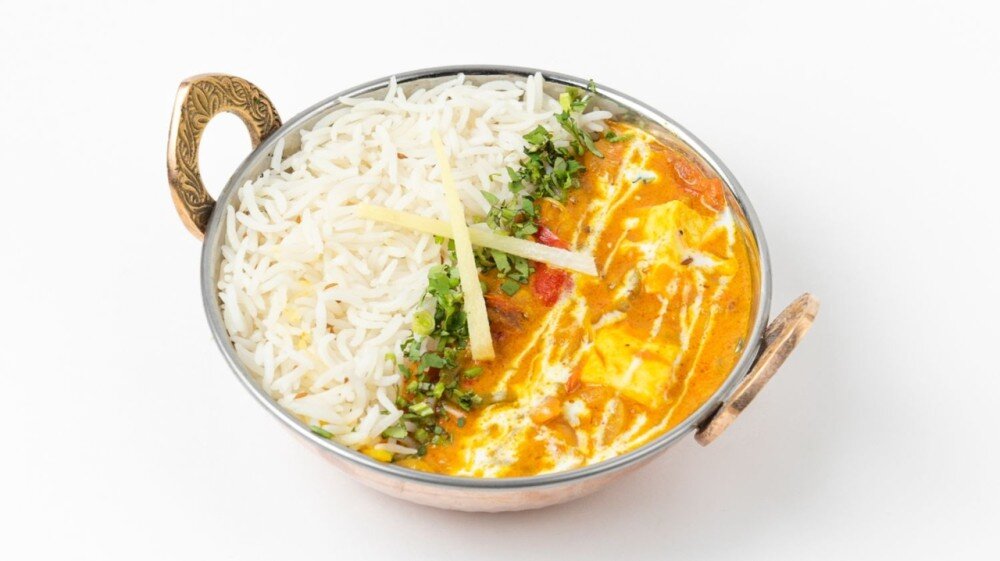Карри тұздығындағы үнді панир ірімшігі бар көкөніс бұқтырмасы. Күрішпен бірге беріледі