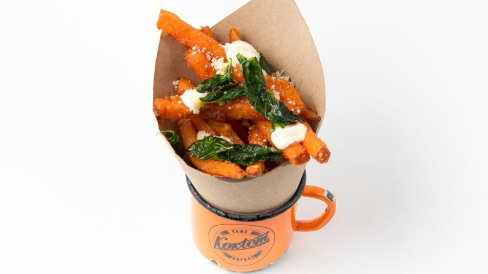 Тәтті картоп, тұз, пармезан, қуырылған насыбайгүл және көк ірімшік тұздығы