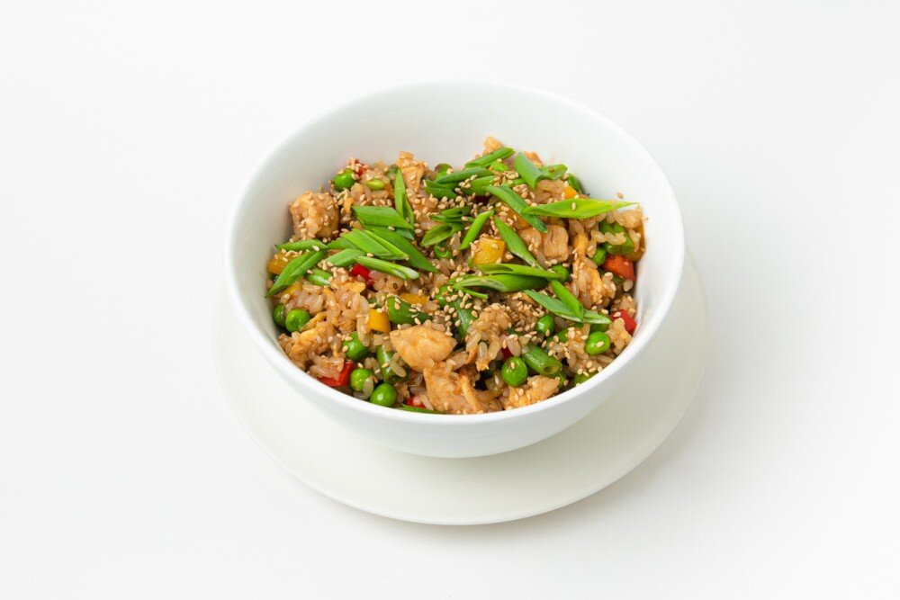 Күріш, жасыл бұршақ, болгар бұрышы, соя тұздығы, Терияки тұздығы, тәтті чили тұздығы, тауық еті, күнжіт тұқымдары, жасыл пияз.