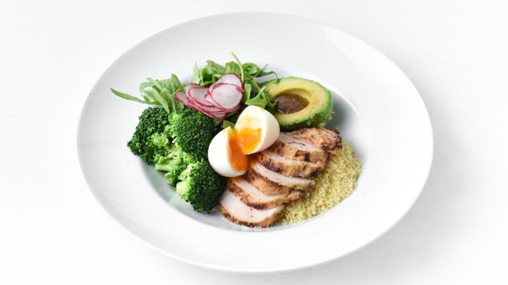 Қуырылған тауық еті, кускус, авокадо, руккола, шалғам, брокколи және пісірілген жұмыртқа қосылған, бал-қыша және песто тұздығымен берілетін ерекше салат