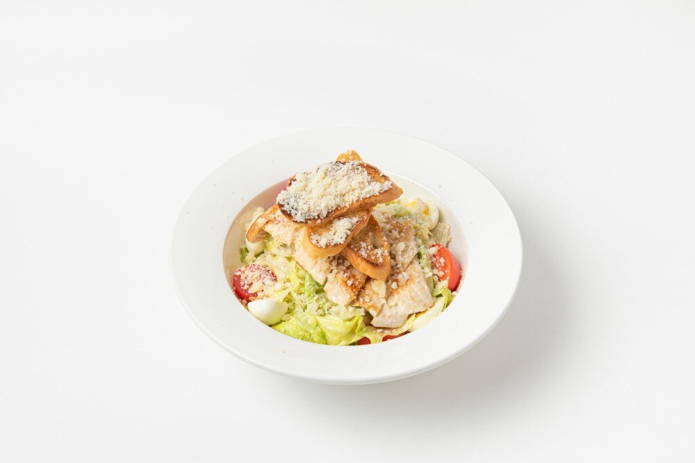 Айсберг, черри қызанақтары, бөдене жұмыртқалары және қуырылған тауық еті, цезарь тұздығы негізінде жасалған салат