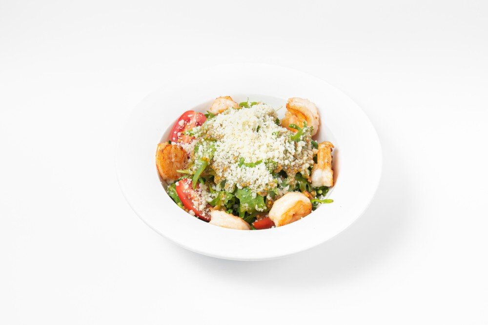 Руккола, жолбарыс асшаяндары, шие қызанақтары, зәйтүн май және қыша тұздығымен дәмделіп, пармезан ірімшігімен безендіріледі