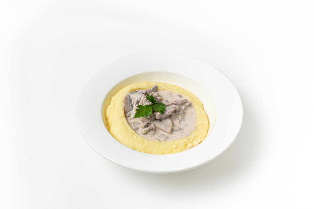 Саңырауқұлақ қосылған тұздықтағы сиыр еті, картоп пюресімен беріледі