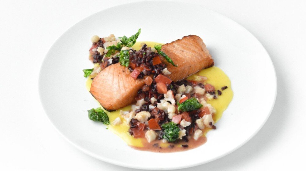 Сары майда ақсерке еті тасшөп және сарымсақпен бірге қуырылып, италияндық қара венера күріші, гүлді қырыққабат және қызанақтармен толықтырылып, француз Бер-блан тұздығымен беріледі