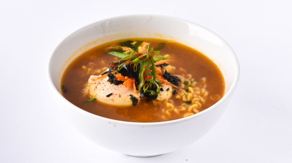 Оңтүстік Кореялық Рамен Ансутамен, сиыр сорпасы мен ащы дәмдеуіштерге негізделген, жұмыртқа, көкөністер, бидай-жұмыртқа кеспесі және қуырылған нори балдыры