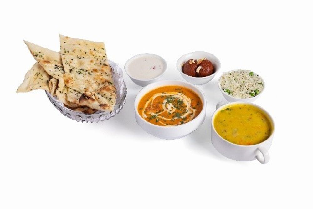 Тауық еті сорпасы Тауық батыр Басмати күріш Райт соусы Бартер наан Десерт Ладу (десерт) Морзе