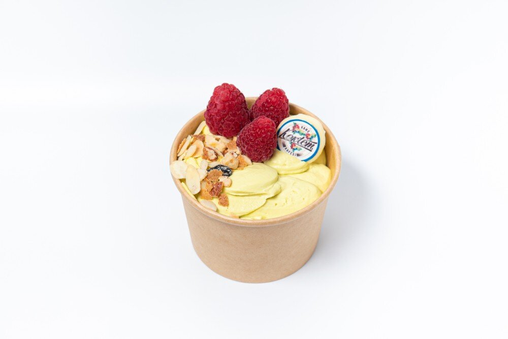 Маскарпоне ірімшігі негізіндегі тирамису, пісте пастасы қосылған, түйіршіктермен және таңқураймен безендірілген эспрессоға малынған савоаарди печеньелері (алкогольсіз)