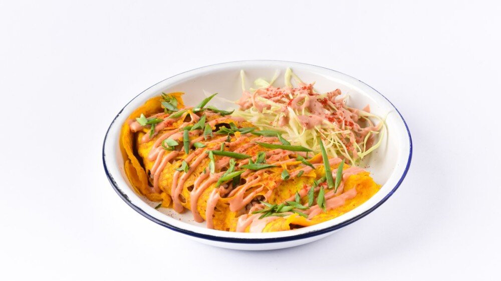 салмасы: сәбіз, картоп, корей дәмдеуіштері, маринадталған сиыр еті, күріш, жұмыртқа құймақтары, колелав салаты: майонез, кетчуп, ақ қырыққабат, көк пияз