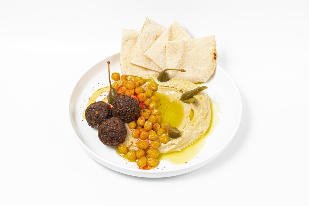 Ноқат, күнжіт, күнжіт майы, жасыл бұршақ фалафель, тұз, зире, лимон, каперс, паприка, зәйтүн майы, конишондер.