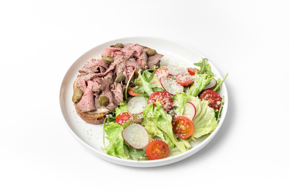 Бұзау еті, каперсы, тартин наны, Вителло тоннато соусы, руккола, жапырақ салаты, шалғам, черри қызанағы, айсберг салаты, пармезан ірімшігі.